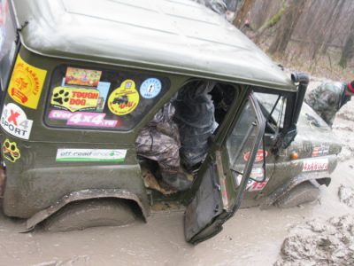 Но перед самым стартом руководители соревнований присмотрелись к нам и отправили нас в средний класс. Старт. Веселиться начали с первых секунд заезда. Место старта на пригорке, ухаешься в овраг и надо с разгону вылететь на другом берегу оврага. А мы с ходу ухнулись, да силенок не рассчитали. Так и подвисли в нижней точке. Появился повод поюзать новую лебедку. Помогло. Сорвались из засады и с первого раза взяли препятствие. А вот впереди нас Уазик нафаршированный наглаживал вертикальную стенку оврага несколько раз, но всё же выехал. Радостно попрощались с Ожегом и поскакали. Первая контрольная точка нас не напрягла, сдалась сходу. Дальше на своей шкуре прочувствовали вредность хозяев. Вот она промежуточная цель, рядом локоток, а не укусишь. Цифры начертаны как избушка-на-курьих-ножках: к лесу передом, а к нам задом и преграда перед ними ма-а-а-ленькая, но наглая - проще китайский выучить, или марксизм-ленинизм сдать. На фотографии 14-ый КП с «лечебной» грязью и наши «процедуры» в ней.